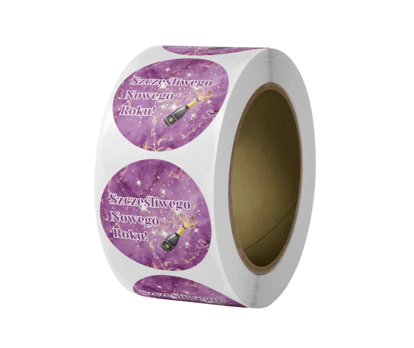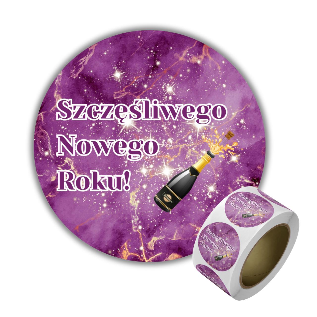Naklejki Sylwestrowe – Szczęśliwego Nowego Roku, fioletowe – Ø 50 mm